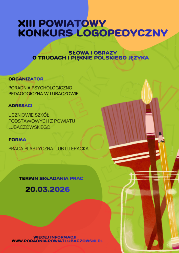 Z okazji Europejskiego Dnia logopedy serdecznie zapraszamy uczniów Szkół Podstawowych z powiatu lubaczowskiego do udziału w XIII Powiatowym Konkursie Logopedycznym pt.„Słowa i obrazy – o trudach i pięknie polskiego języka”, który ma na celu zwrócić uwagę na piękno ojczystego języka oraz upowszechniać kulturę żywego słowa.